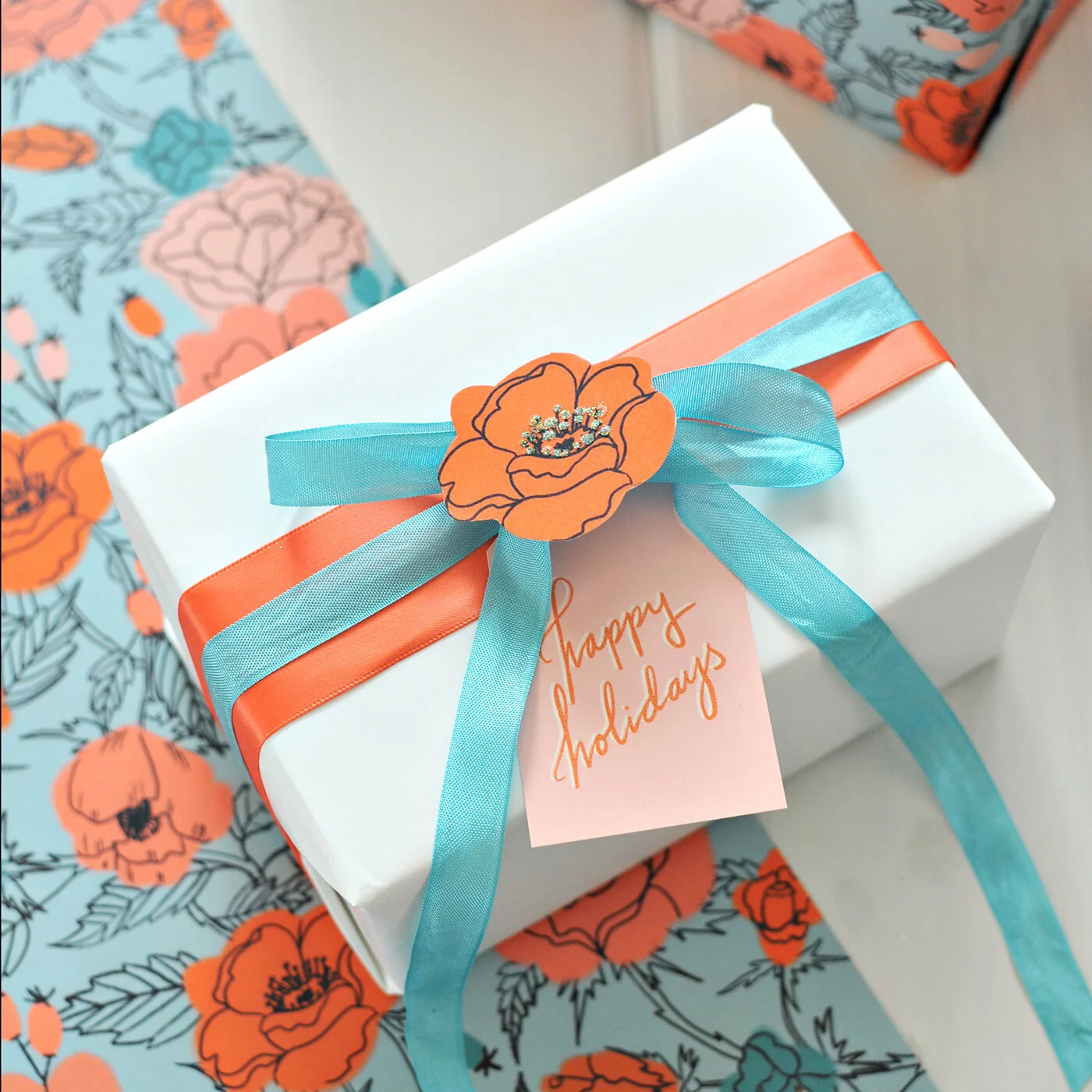 This year I decided I would design my very own gift wrap using my favorite colors: peach, coral, orangey-red, turquoise, and aqua blue too! I dreamed of making something that would work for more than just one occasion, and that’s how my Winter Roses print was born! You can find these luscious satiny-matte wrapping paper sheets (5 - 20”x29” sheets per set) over in my Society6 shop.